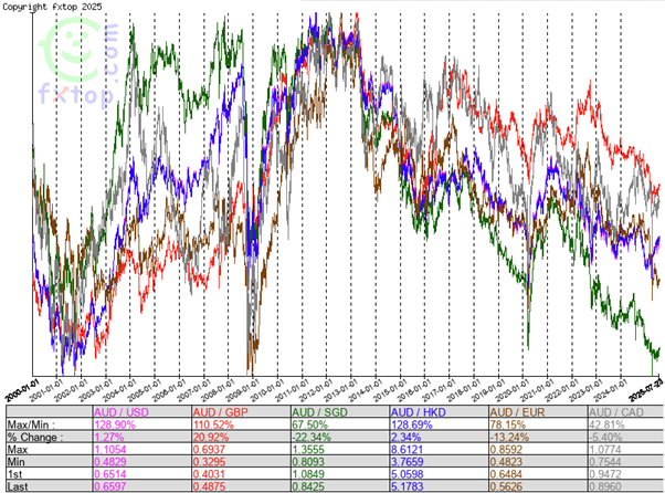 Chart: Currency fluctuations (AUD pairings), since 2000